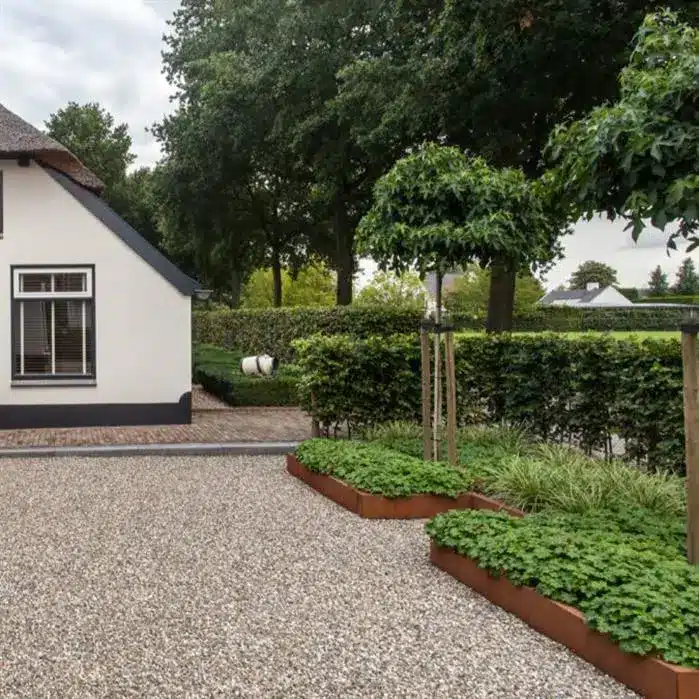 In Kombination mit anderen Cortenstahl-Bordüren trägt diese Bordüre zu einem stimmigen und eleganten Gartenlayout bei.