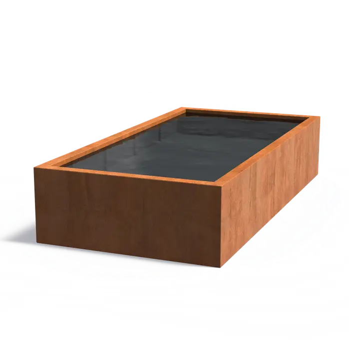 Das Standard-Wasserbecken aus Cortenstahl bringt eine ruhige und elegante Wirkung in Gärten, auf Terrassen und in landschaftliche Außenanlagen. Seine klare, rechteckige Form fügt sich harmonisch in moderne ebenso wie in klassische Gestaltungskonzepte ein.